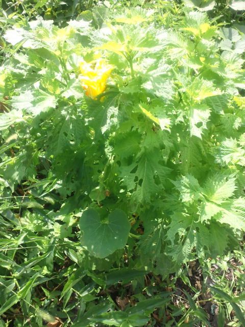 カボチャのツルの間から、自生しているオオバ(シソ)がいます。