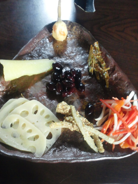 慈姑、数の子、紅白なます、酢蓮、酢ゴボウ、黒豆、田作りです。