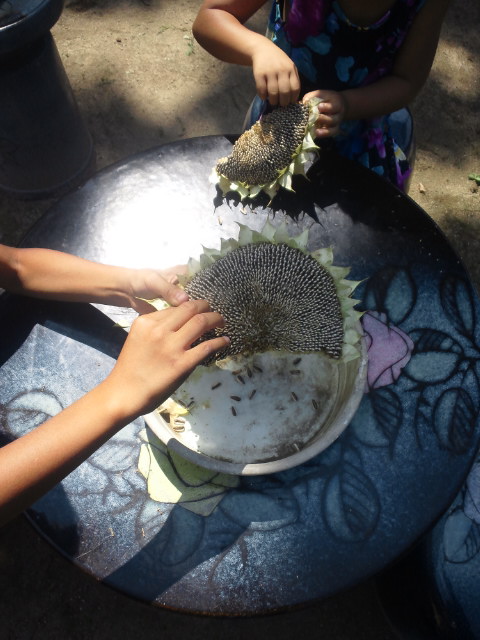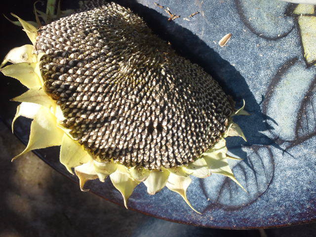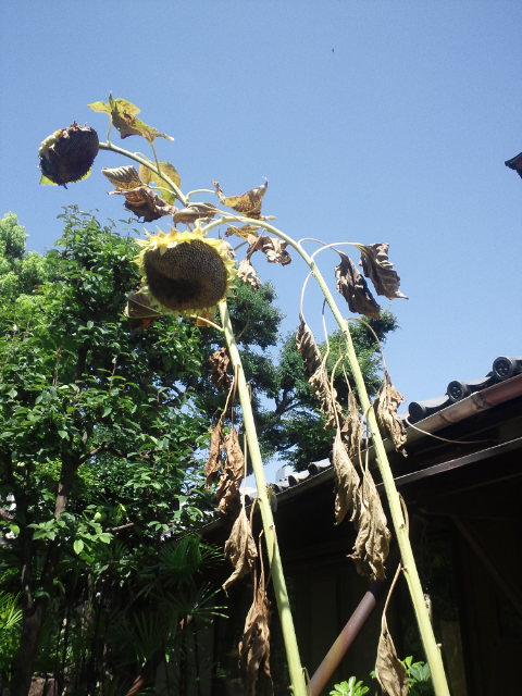 今日は、ひまわりの葉が全部枯れたので種取りです。
