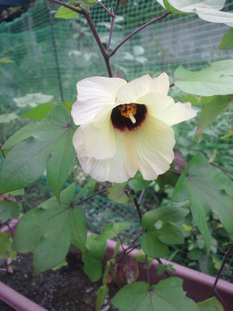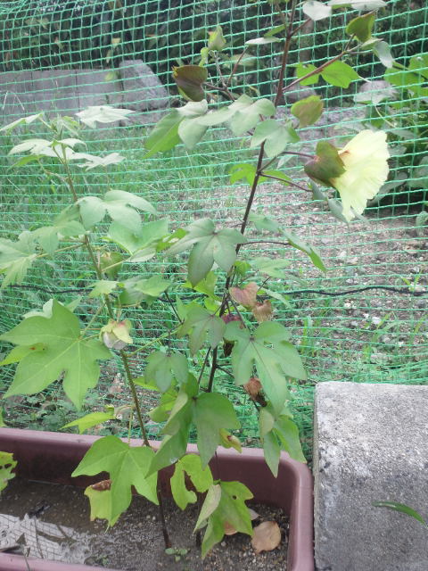 わた花のプランターは、息子管理で基本的には放置でしたから、ひょろひょろしていて、葉も虫に沢山食べられてます。