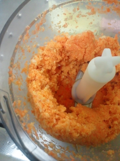 ①ニンジンと古くなったり残ったパンを、フードプロセッサで粉砕。