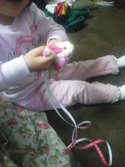 キリキリキリ、シュルシュルシュルとうさちゃんメジャーで娘が遊んでます。