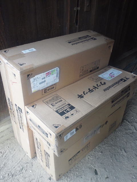 ウッドデッキ が入った大きな箱と踏み台と足が入った箱、手すりの入った箱の