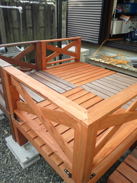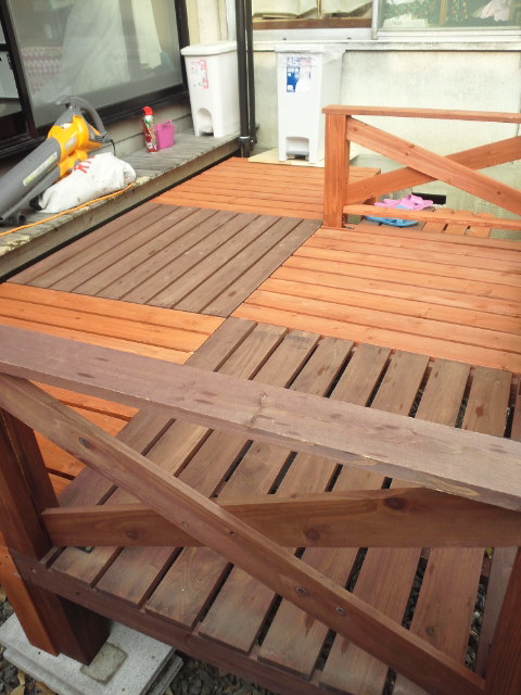 元々のウッドデッキは、古くなっているため新しいのとは色合いがちがいます。