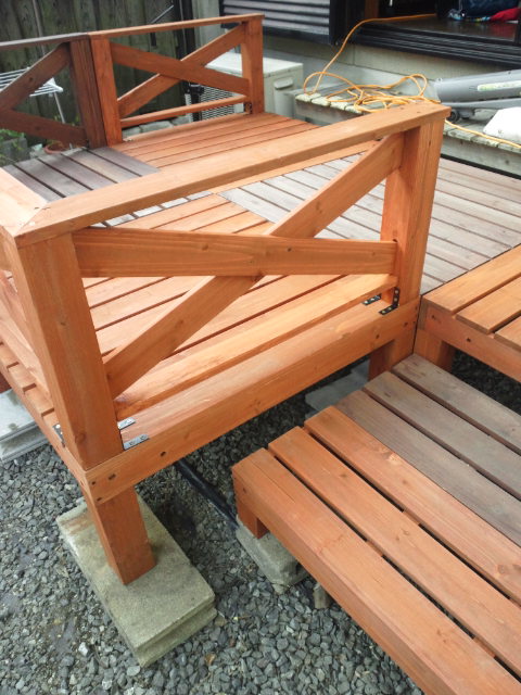 手すりの下の方にも横板が入っていてよりシッカリしたのですが、 ウッドデッキ 本体にネジ止めする時には、かなり邪魔で苦労しました(>Σ<)