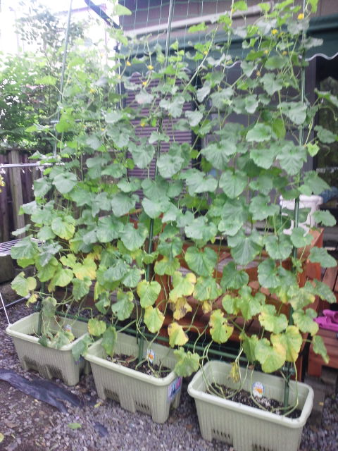 マクワのグリーンカーテンは、孫ツルを伸ばすために子ツルを摘芯したので少し成長が止まってるみたいです。