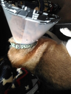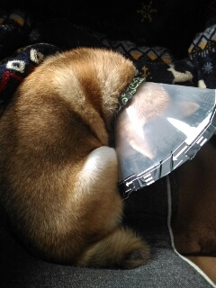 大きなエリカラつけてるのに、無理やり座椅子の上で丸まります。