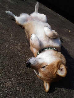 へそ天でお腹も日光浴なんだワンの柴犬さくらに、