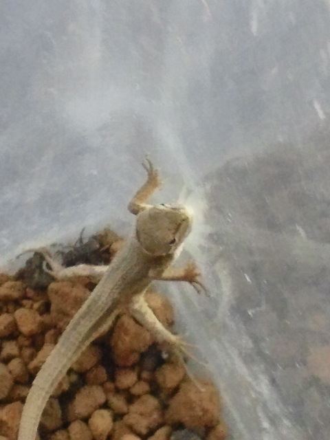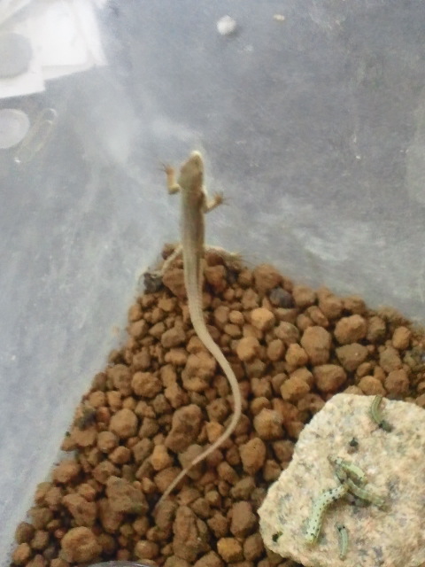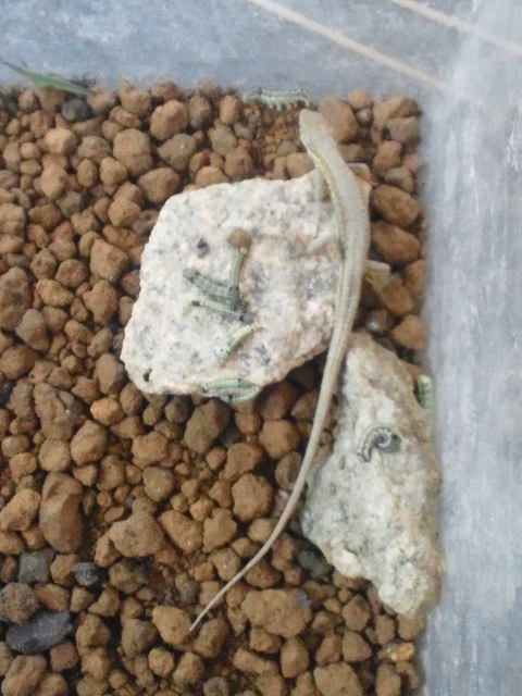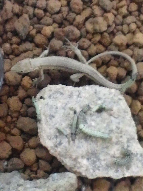 いきなり、天からイモ虫が降ってきたから、驚いたカナヘビ君。
