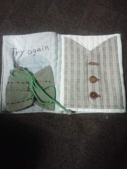 ひもをほどいたり、結んだりするページと、ボタンを外したり留めたりするページ。