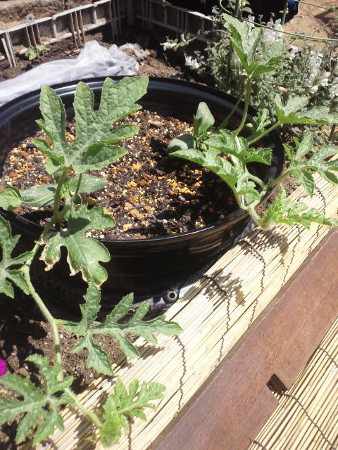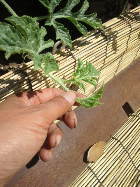 スイカも本葉が増えて来たので、摘芯して子蔓を伸ばします。