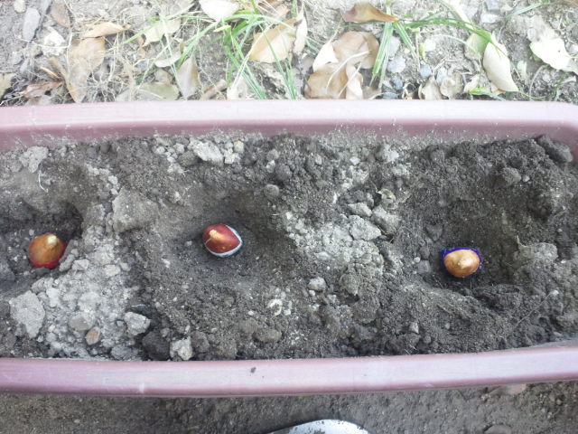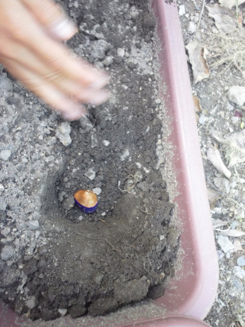 プランター1個に付き、3球づつ頭が2cmくらい土に隠れるように置いていきます。