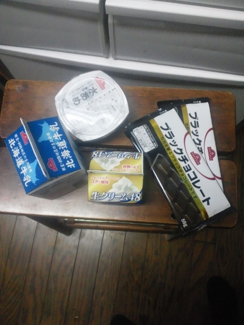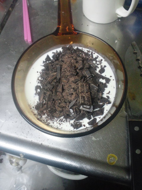 2.生クリームを耐熱容器に入れてラップせずに500wの電子レンジで30秒加熱し、チョコを加えて少しおき、溶けてきたらかき混ぜます。