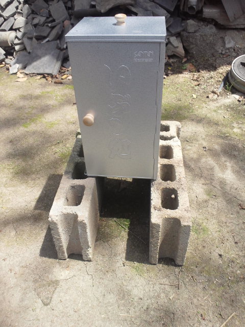 庭にブロックで釜戸を造り(とは言ってもブロックで囲っただけですが…)、燻製器をセットします。