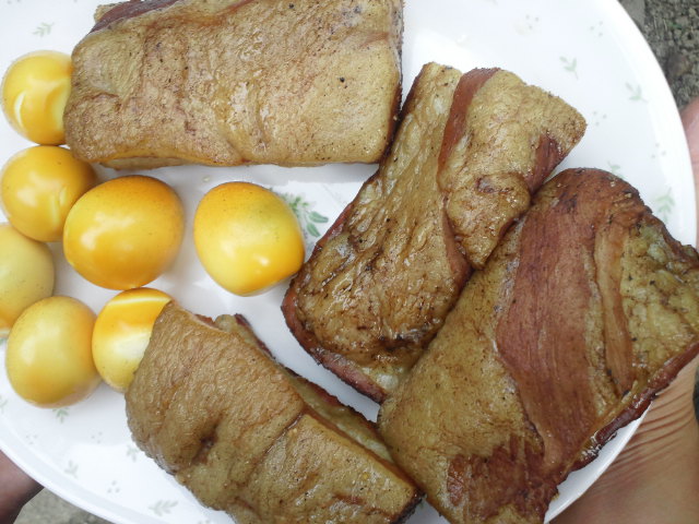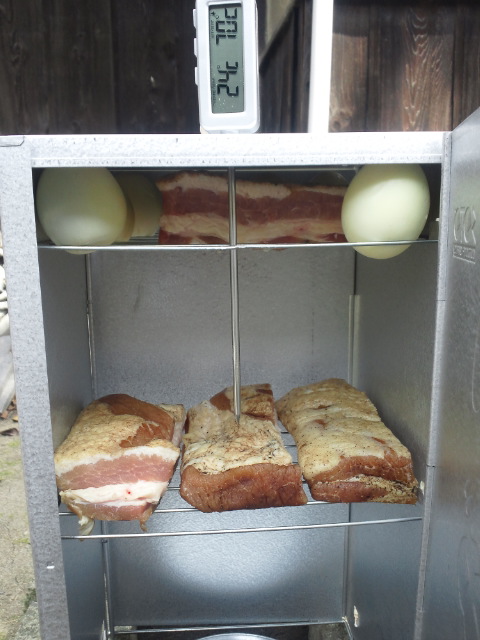 塩漬け肉とママがコッソリ作った燻製にするためのゆで卵を燻製器にセット♪