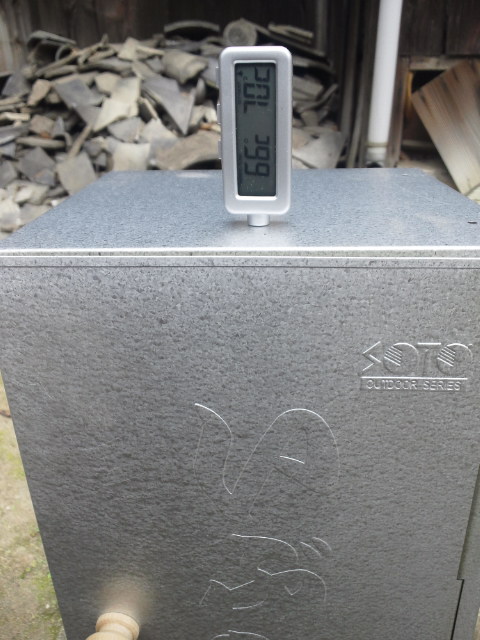 やって所定の60℃~70℃の間になったので、ウッドブロックにバーナーで火を着けます。