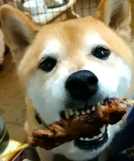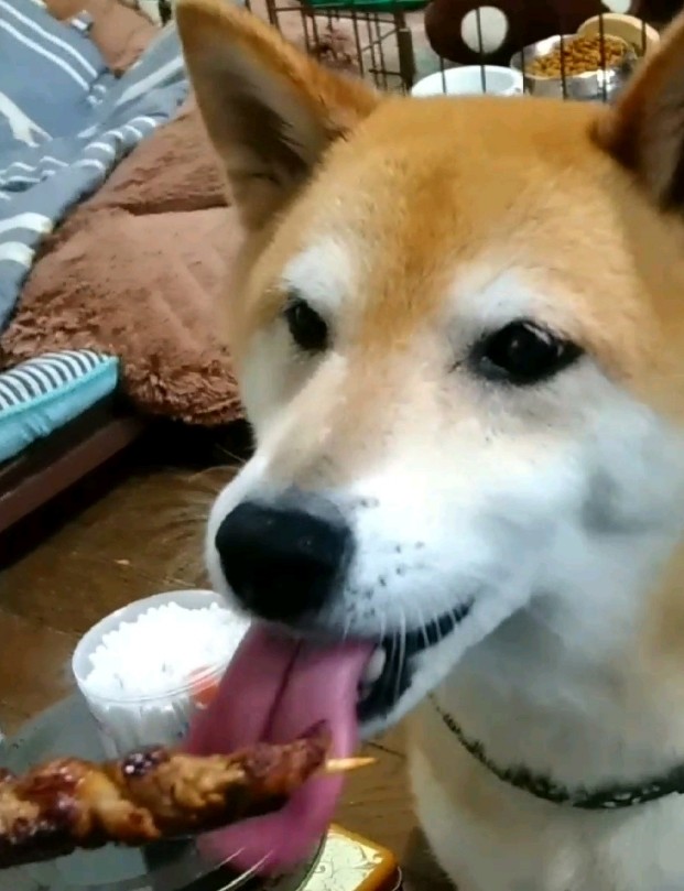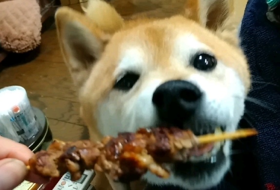 久しぶりの肉串にワクワクが止まらない柴犬さん。