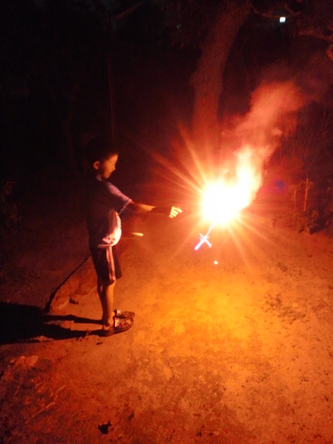 手持ち花火を持って立たせて、トーチキャンドルで火を着けます。