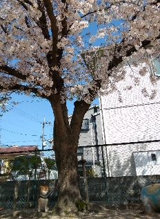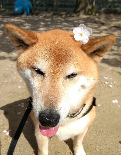 わけもかからず、桜の下で座らされる柴犬さん。