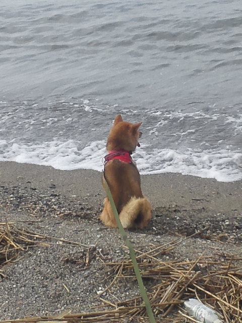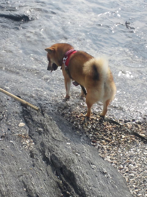 波打ち際で不思議そうにしている柴犬さくら。