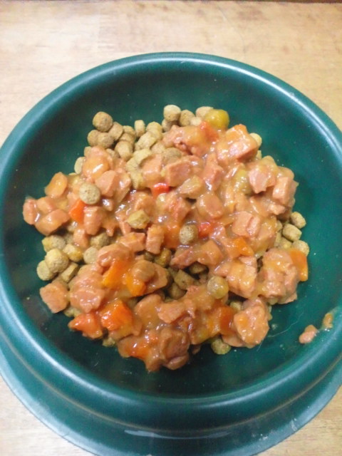 何時ものカリカリフードに牛肉と野菜の柔らか煮をトッピング。