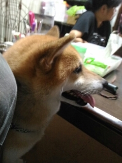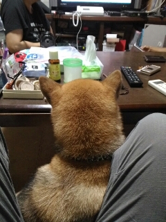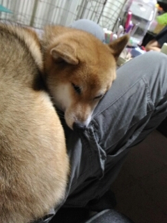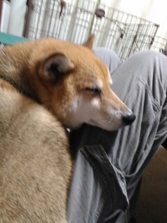 膝の上に上がり、さらに寛ぐ柴犬さん。