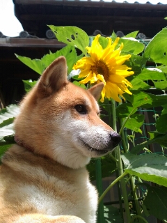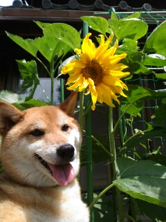 昨日、ママに手伝ってもらって向日葵と柴犬さくらのコラボ
