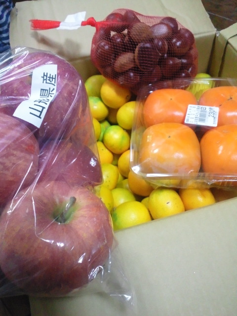 ミカン10キロ、リンゴ、柿、栗を買いました。