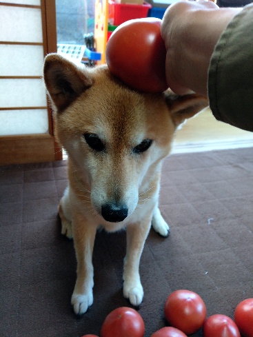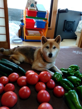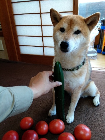 お野菜立派すぎて、頭に乗っけるのは断念なんだワンの柴犬さくらに、