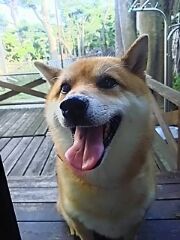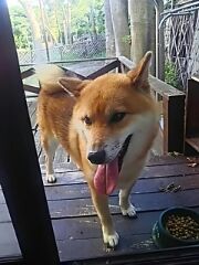 柴犬さくらは、ウッドデッキで食事します。