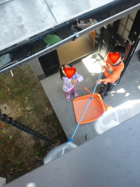 パパが屋根に登って柿を採り、子供達か虫取り網でキャッチ…