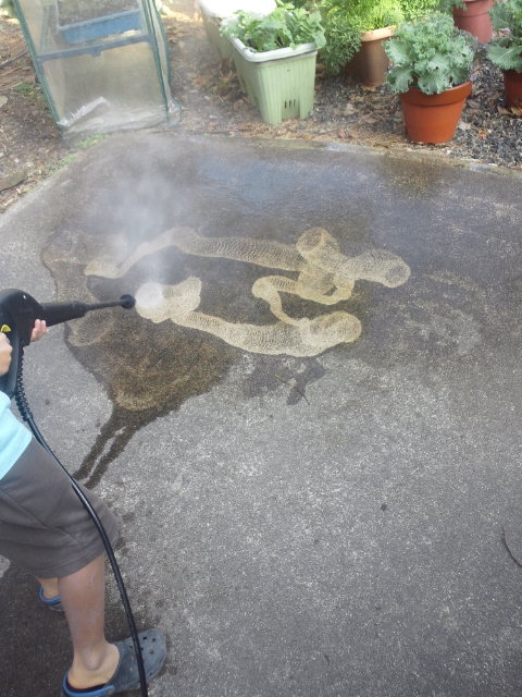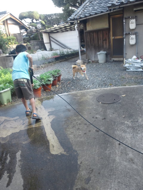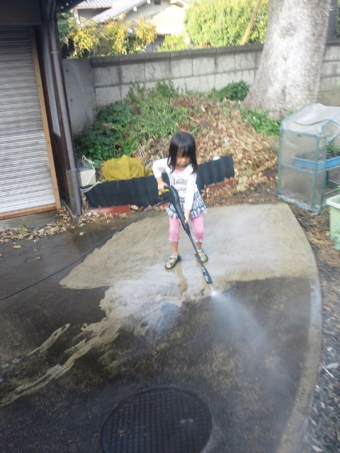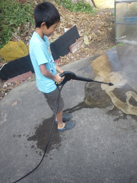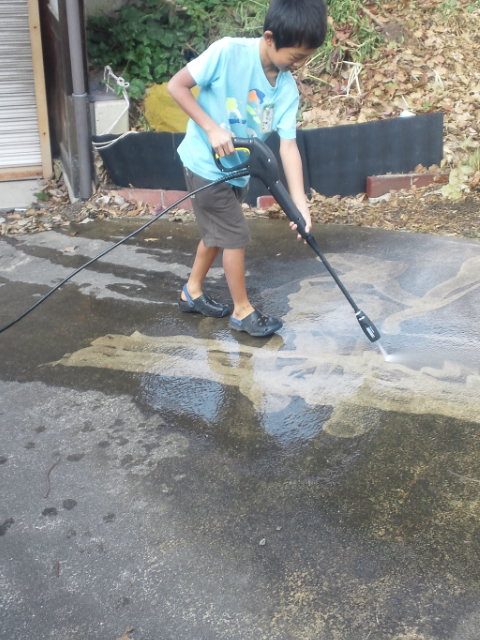 初めは戸惑っていた息子も、だんだんと慣れて来て、高圧洗浄機をモップのように動かして行きます。