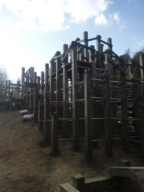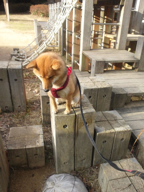 江汐公園の木で作られた遊具に、さくらも挑戦。