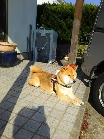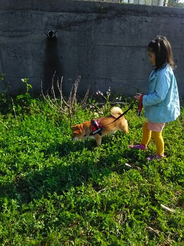 姪にリードを持たれても、マイペースな柴犬さくら。