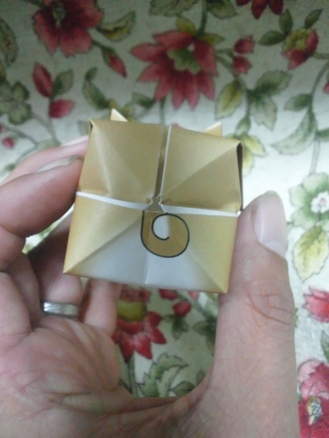 ちょっと変則的なプリントがされた折り紙を、折っていくと出来上がり!