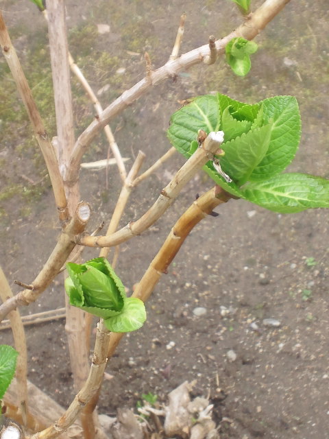 紫陽花の新芽の緑が力強く出て来ました。