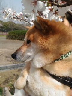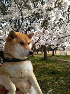 やけに、人間臭く、偉そうに桜に見物の柴犬さくら。