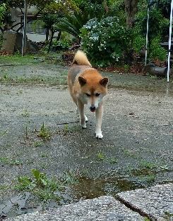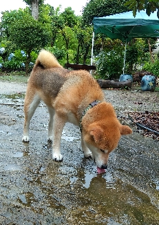 帰り始めてから、なぜか水たまりの水を飲み始める柴犬さん。