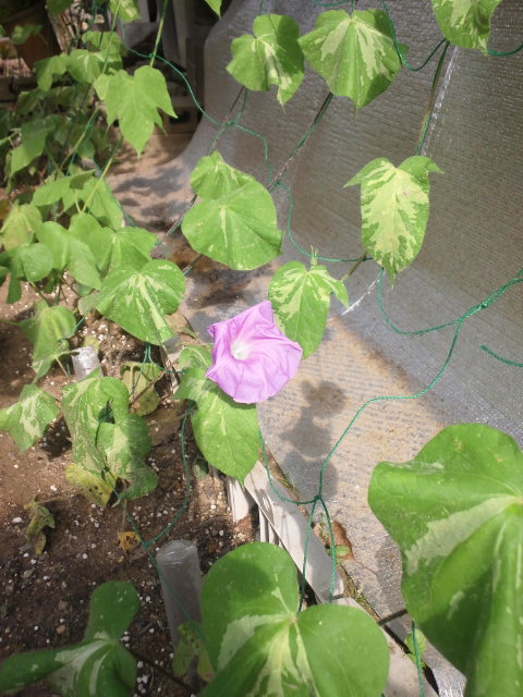 まだまだグリーンカーテンにはほど遠い貧弱な葉とつるですが、咲いちゃいましたf^_^;