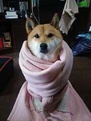 ピンクの衣装を纏ってすまし顔の柴犬さくら。