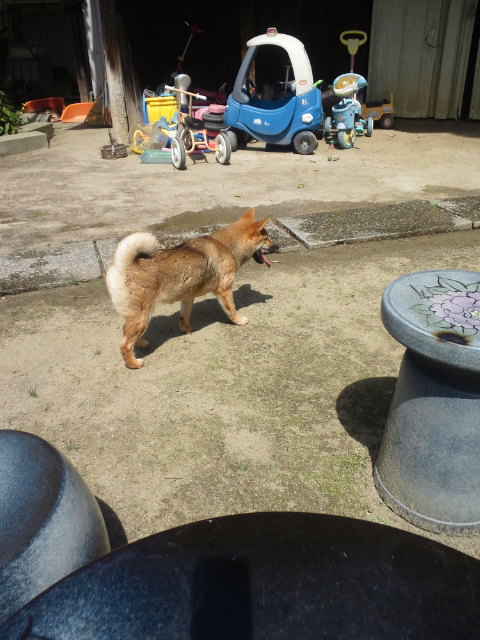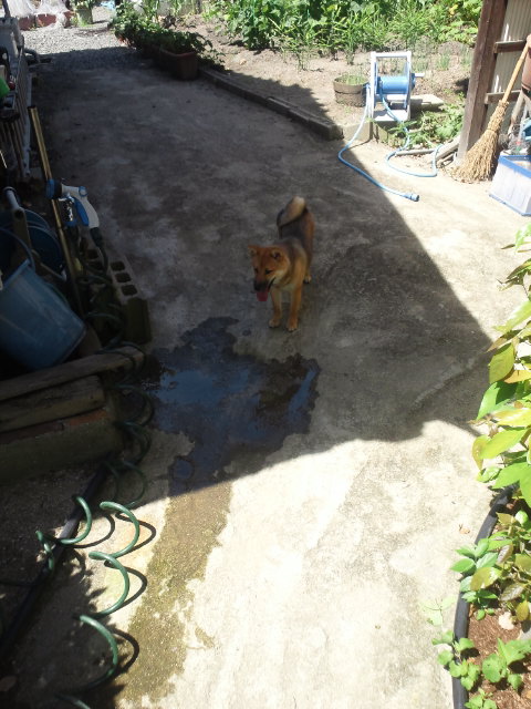 柴犬 さくらは、すぐに日陰に逃げ込みます。
