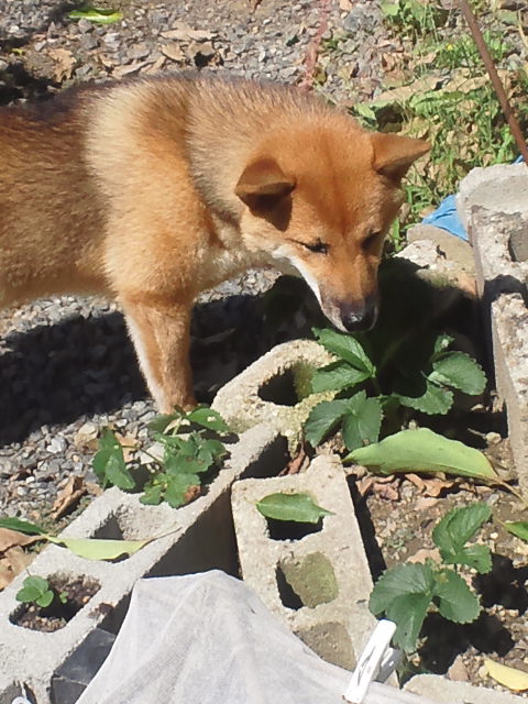 イチゴ畑だけでなく、プランターに植えたイチゴにもちょっかい出してた柴犬 さくら。