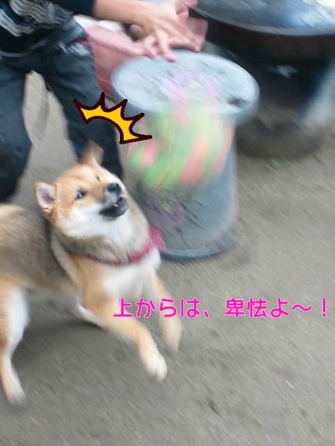 上から落ちてくるフリスビーにビビりまくりの柴犬さくらです(笑)
