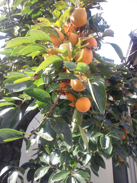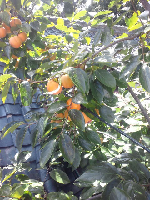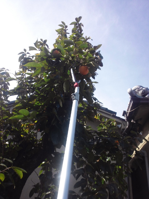 屋根のそばにある柿は、普通の剪定ハサミでチョキチョキ。