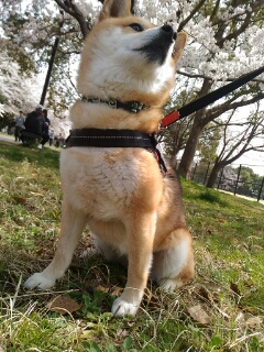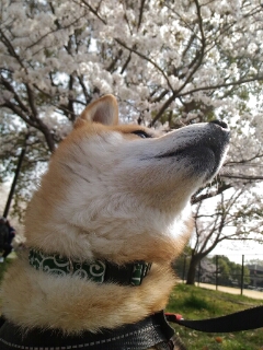 桜を愛でるように、眺めてる和犬。