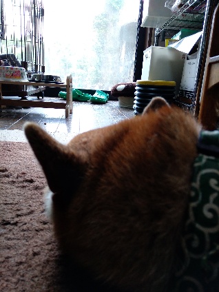 雨がやまないかなと外を見つめていた柴犬さくら。
