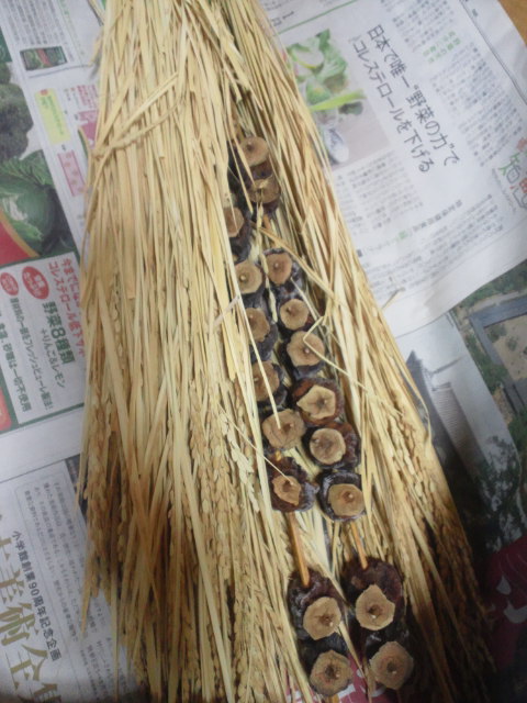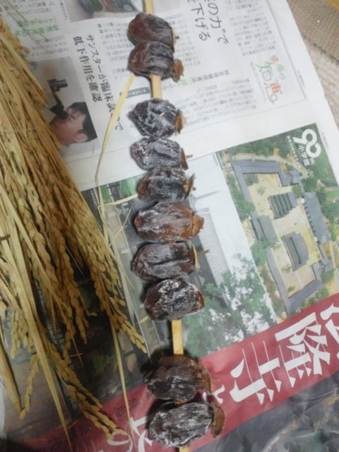 串柿には、保存のためワラの中で白く粉を吹かせていました。