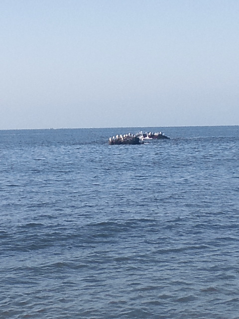 顔を出した岩には、カモメたちが休んでます。
