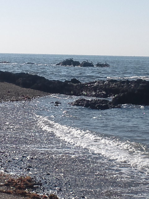 引き潮なら歩いて行ける岩場も海の中です。