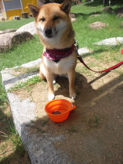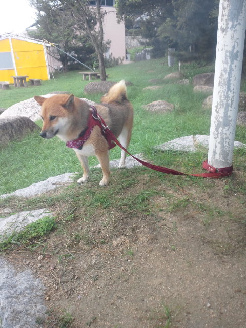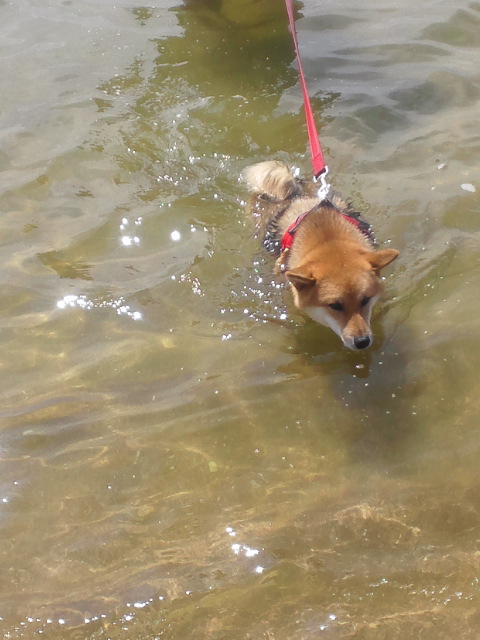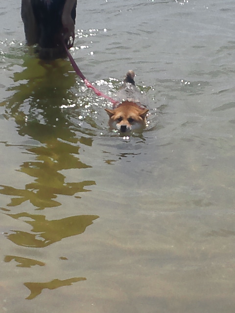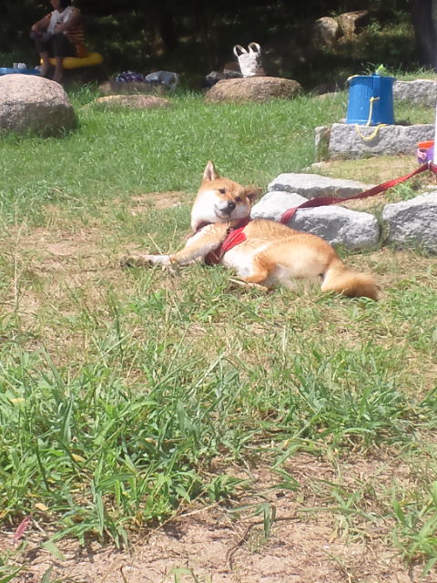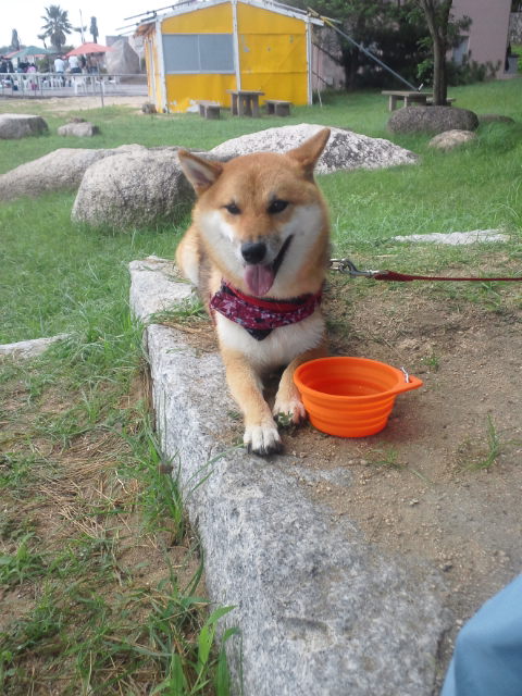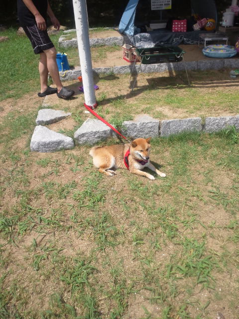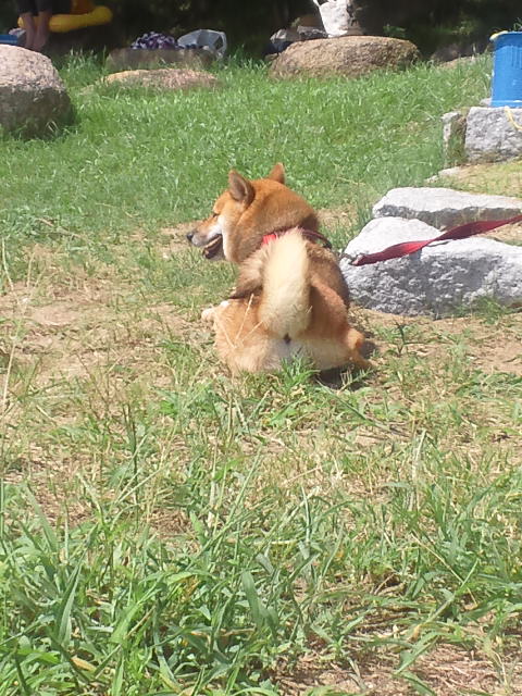 ひと泳ぎしてから、休憩中の柴犬さくら。